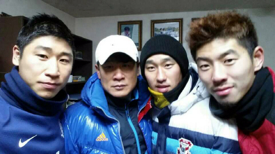 2014년 1월, 동기생인 이근호 백종환 하대성(왼쪽부터)이 모교인 부평동중학교를 찾아 신호철 감독(왼쪽에서 두 번째)과 기념 사진을 찍고 있다. 사진제공=신호철 감독