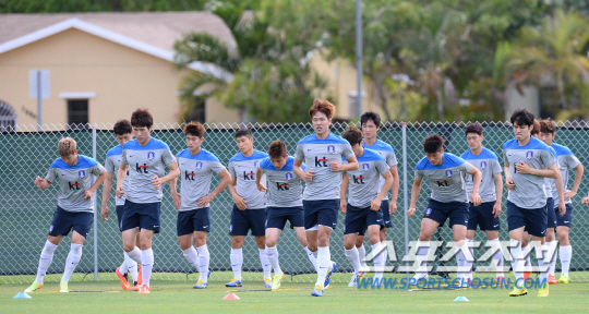 2014브라질월드컵 대표팀 선수들이 1일(한국시간) 미국 마이애미 전지훈련장인 세인트토마스대학교 경기장에서 몸을 풀고 있다. 브라질에 들어가기 전 시차와 고온의 기후 등을 적응하기 위해 마이애미에 훈련캠프를 차린 대표팀은 다음달 9일까지 적응훈련을 마친후 10일 가나와 최종 평가전을 마치고 브라질로 떠난다. 마이애미(미국)=최문영 기자 deer@sportschosun.com