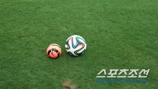 ◇골키퍼 훈련에 사용된 스킬볼(왼쪽)은 2014년 브라질월드컵 공인구 브라주카의 절반 크기다.