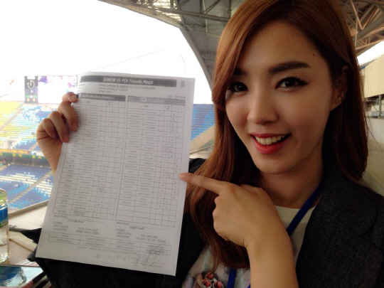 PSV에인트호벤전에서 정인영 아나운서가 선발 명단을 가리키며 포즈를 취했다. 사진제공=정인영
