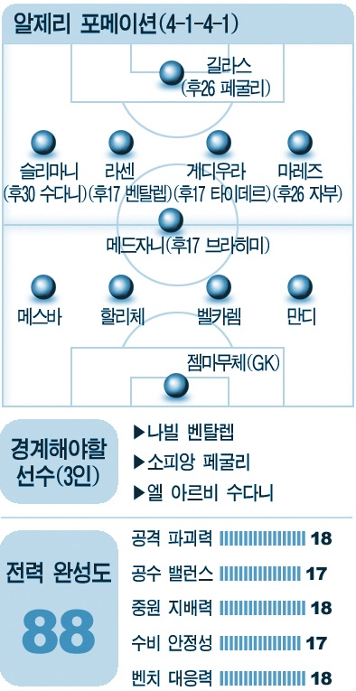 알제리는 1일 아르메니아전에서 주전선수 대부분을 벤치에 앉혔다. 백업멤버를 선발로 내세웠다. 주전들이 대거 출전했던 3월 6일 슬로베니아전과 비교하면, 73%(8명)의 새 얼굴이 나섰다. 주전-백업간 격차를 확인하기 위한 바히드 할리호지치 알제리대표팀 감독의 전략이었다. 이날 알제리대표팀에서 주목할 만한 점은 다양한 공격 루트다. 전반 13분 터진 에사이드 벨카렘의 선제골은 코너킥이 시발점이었다. 세트피스의 강점을 보여줬다. 추가골은 필드 골이었다. 전반 22분 나빌 길라스가 오른발 슛으로 골망을 흔들었다. 사실 미드필더 리야드 마레즈의 45m 단독 돌파가 큰 힘이 됐다. 전반 41분 이슬람 슬리마니의 쐐기골은 헤딩 골이었다. 특히 두 번째 골 장면을 홍명보호는 조심할 필요가 있다. 상대 공격 차단 이후 빠른 스피드를 활용한 돌파로 수비진을 허무는 패스까지 알제리대표팀에는 '중원 킬러'들이 다수 존재한다. 이날 후반 교체 투입된 나빌 벤 탈렙과 소피앙 페굴리, 압델무멘 자부도 버티고 있다.