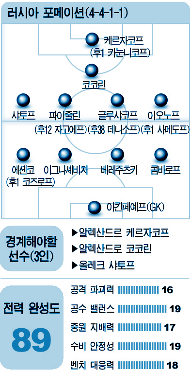 ☞대응 TIP=발이 느린 센터백들은 수비 뒷공간으로 넘어들어오는 패스에 여러차례 고전했다. 양쪽 측면에서 빠르게 침투하는 상대 공격형 미드필더들을 몇차례 놓쳤다. 박주영이 러시아 센터백을 끌고 나온 후 손흥민 이청용 구자철로 구성된 2선 공격수들이 문전침투를 적극적으로 할 필요가 있다. 수비에서는 러시아 역습의 시발점이 될 중앙 미드필더들의 첫번째 패스를 적극 차단해야 한다. 이 줄기가 막히면 위력이 반감된다.