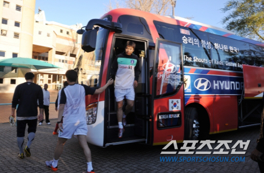 스포츠조선 2010년 6월 5일 5일 오후 남아프리카공화국 루스텐버그에 위치한 올림피아파크 경기장에서 첫 남아공 훈련을 시작한 한국 축구국가대표팀 이동국이 경찰의 호위속에 버스에서 내리고 있다. < 루스텐버그(남아프리카공화국)= 김경민 기자 kyungmin@sportschosun.com > |