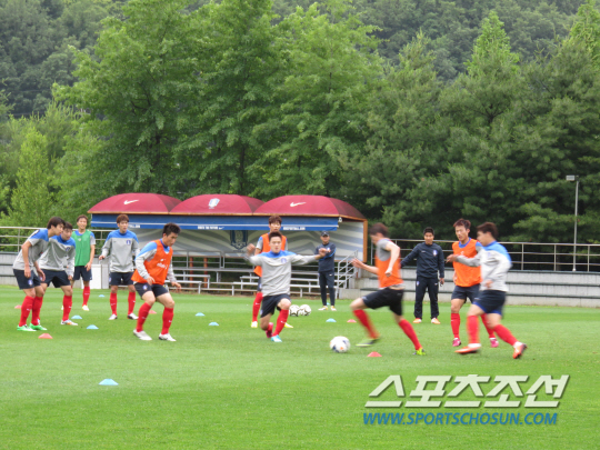 이광종 감독이 이끄는 23세 이하 대표팀은 3일 파주NFC 새싹구장에서 오후 훈련을 실시했다. 아침부터 내린 비는 오후까지 그칠 기미를 보이지 않았다. 부슬부슬 떨어지는 빗속에 선수들은 오렌지, 그린 조끼를 나눠입었다. 3개조로 나뉘어 패스게임과 미니게임을 이어갔다. 패스게임의 템포는 빨랐다. 미니게임에선 골을 향한 승부욕에 불탔다. 김경중 이종호 이용재 등의 골이 작렬할 때마다 "루니! 좋아" "용재, 잘했어!" 등 격려를 아끼지 않았다. 또래들끼리 경쟁하고 공존하며 몰입했다. 즐거운 표정이 역력했다. 갑자기 빗줄기가 굵어지자 이 감독이 손을 들어올렸다. 훈련중단을 지시했다. 비와 땀에 흠뻑 젖은 선수들이 우렁찬 목소리로 "수고하셨습니다!"를 외친 후 삼삼오오 방으로 돌아갔다.