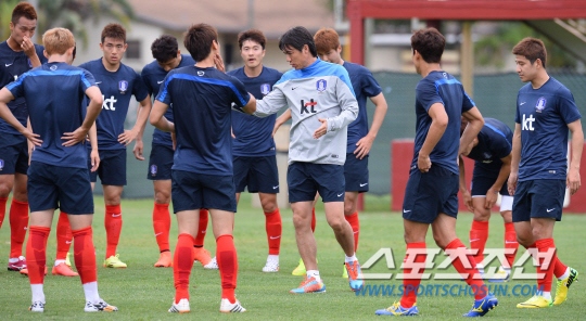 2014브라질월드컵 축구대표팀 홍명보감독이 3일(한국시간) 미국의 전지훈련장인 세인트토마스대학교 경기장에서 선수들의 전술훈련을 지도하고 있다. 브라질에 들어가기 전 시차와 고온의 기후 등을 적응하기 위해 마이애미에 훈련캠프를 차린 대표팀은 다음달 9일까지 적응훈련을 마친후 10일 가나와 최종 평가전을 마치고 브라질로 떠난다. 마이애미(미국)=최문영 기자 deer@sportschosun.com
