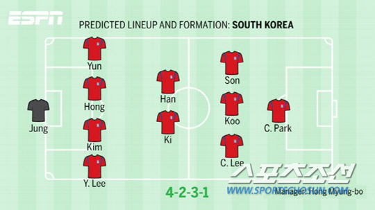 한국의 예상 포메이션으로는 최전방의 박주영 뒤에 구자철-이청용-손흥민이 포진하고, 기성용과 한국영이 뒤를 받치며, 윤석영-홍정호-김영권-이용이 포백으로 나설 것이라고 예측했다.
