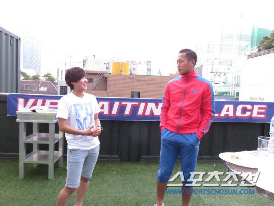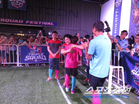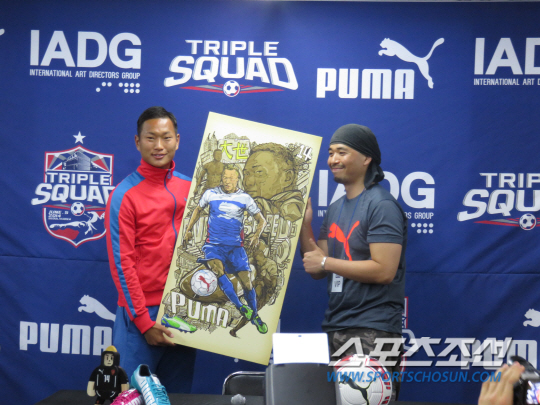 5일 오후 7시 서울 논현동 플래툰 쿤스트할레에서 열린 축구를 주제로 한 아티스트들의 신개념 복합 문화 축제 '트리플스쿼드(Triple Squad) 페스티벌(주최 IADG)'에 나란히 참가했다. '트리플스쿼드' 공식 후원사 푸마의 초청을 받은 이들은 미디어 인터뷰에 이어 2대2 풋살 이벤트 경기에서 함께 발을 맞췄다.