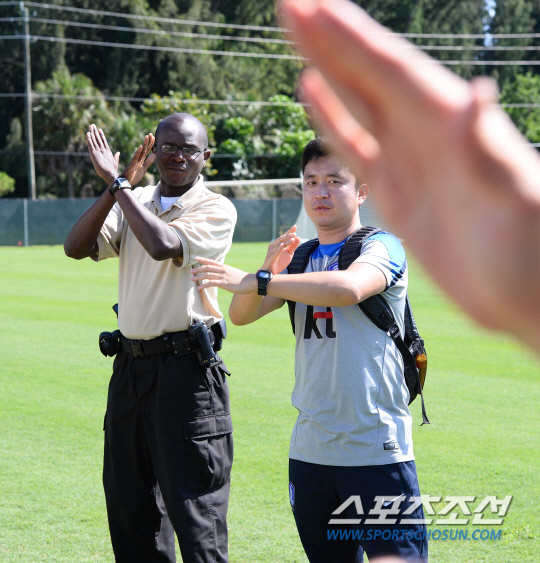 미국 마이애미에 전지훈련장을 차린 2014브라질월드컵 축구대표팀이 훈련 엿새째진 6일(한국시간) 일부 비공개 훈련에 돌입했다. 취재진에게 주어진 15분 공개시간이 지나자 세인트토마스대학교 경비원과 축구협회 관계자가 취재진의 퇴장을 안내하고 있다. 브라질에 들어가기 전 시차와 고온의 기후 등을 적응하기 위해 마이애미에 훈련캠프를 차린 대표팀은 9일까지 적응훈련을 마친후 10일 가나와 최종 평가전을 마치고 브라질로 떠난다. 마이애미(미국)=최문영 기자 deer@sportschosun.com /2014.06.06/ |