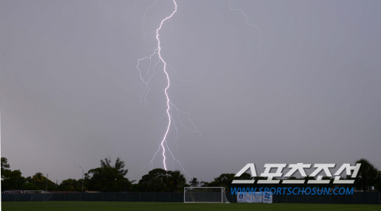 2014브라질월드컵 대표팀이 훈련 9일째인 8일(한국시간) 낙뢰를 동반한 폭우때문에 2시간동안 훈련을 진행하지 못했다. 전지훈련장이 위치한 마이애미 세인트토마스 축구장 골대뒤로 번개가 치고 있다.