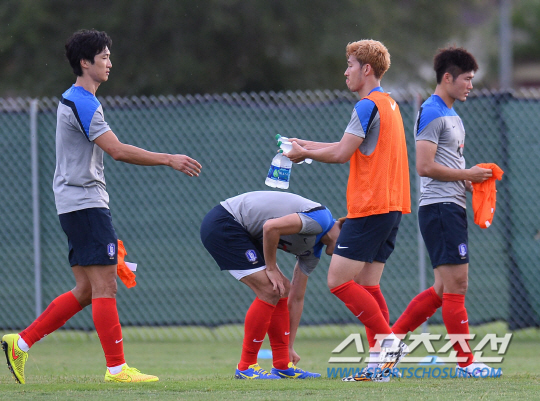2014브라질월드컵 대표팀이 8일(한국시간) 미국 전지훈련장인 마이애미 세인트토마스 대학교에서 9일째 훈련을 진행했다. 훈련을 마친 대표팀 막내 손흥민이 곽태휘에게 물병을 전달하고 있다.
