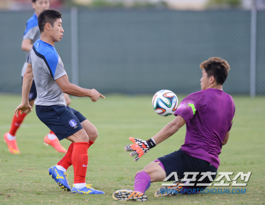 2014브라질월드컵 대표팀이 8일(한국시간) 미국 전지훈련장인 마이애미 세인트토마스 대학교에서 9일째 훈련을 진행했다. 이근호가 골키퍼 정성룡의 수비를 피해 슈팅을 날리고 있다.