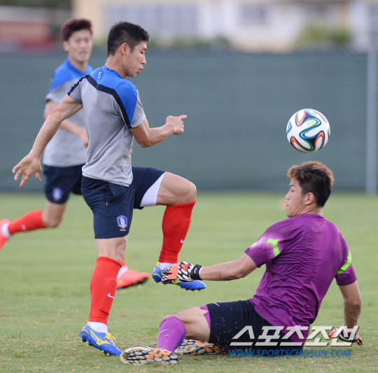 2014브라질월드컵 대표팀이 8일(한국시간) 미국 전지훈련장인 마이애미 세인트토마스 대학교에서 9일째 훈련을 진행했다. 이근호가 골키퍼 정성룡의 수비를 피해 슈팅을 날리고 있다.