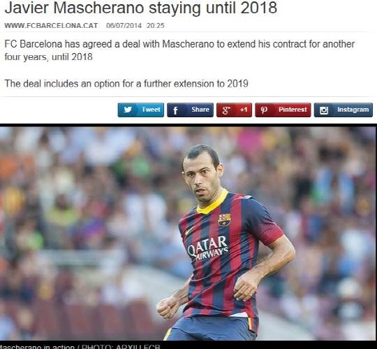 아르헨티나대표팀의 미드필더 하비에르 마스체라노(30)가 바르셀로나와 4년 재계약했다.