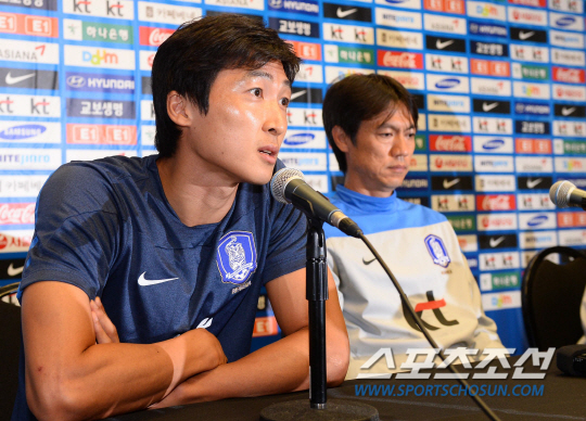 미국 전지훈련중인 2014브라질월드컵 축구대표팀 홍명보 감독과 곽태휘 선수가 가나와의 평가전을 앞둔 9일오전 (한국시간)마이애미 선라이프 스타디움에서 열린 기자회견에서 취재진의 질문에 답하고 있다.