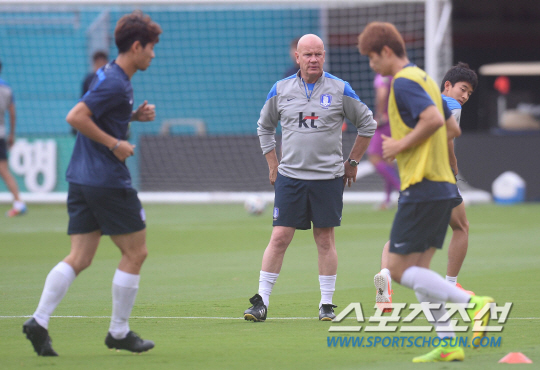 미국 전지훈련중인 2014브라질월드컵 축구대표팀이 가나와의 평가전을 하루 앞둔 9일오전 (한국시간)마이애미 선라이프 스타디움에서 적응훈련을 하고 있다. 상대팀의 전력분석을 위해 유럽출장길에서 돌아온 안톤 두 사트니에 코치가 합류해 선수단을 지켜보고 있다.