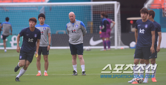 미국 전지훈련중인 2014브라질월드컵 축구대표팀이 가나와의 평가전을 하루 앞둔 9일오전 (한국시간)마이애미 선라이프 스타디움에서 적응훈련을 하고 있다. 상대팀의 전력분석을 위해 유럽출장길에서 돌아온 안톤 두 사트니에 코치가 합류해 선수단을 지켜보고 있다.