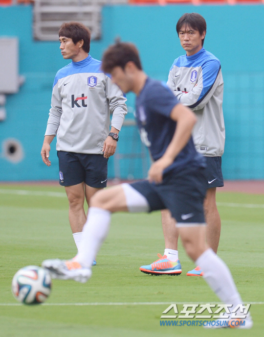 미국 전지훈련중인 2014브라질월드컵 축구대표팀이 가나와의 평가전을 하루 앞둔 9일오전 (한국시간)마이애미 선라이프 스타디움에서 적응훈련을 하고 있다. 홍명보 감독이 가나전을 앞두고 선수들의 컨디션을 점검하고 있다.