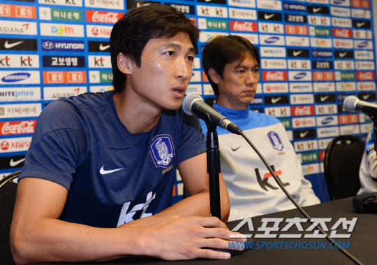 미국 전지훈련중인 2014브라질월드컵 축구대표팀 홍명보 감독과 곽태휘 선수가 가나와의 평가전을 하루 앞둔 9일오전 (한국시간)마이애미 선라이프 스타디움에서 열린 기자회견에서 취재진의 질문에 답하고 있다.