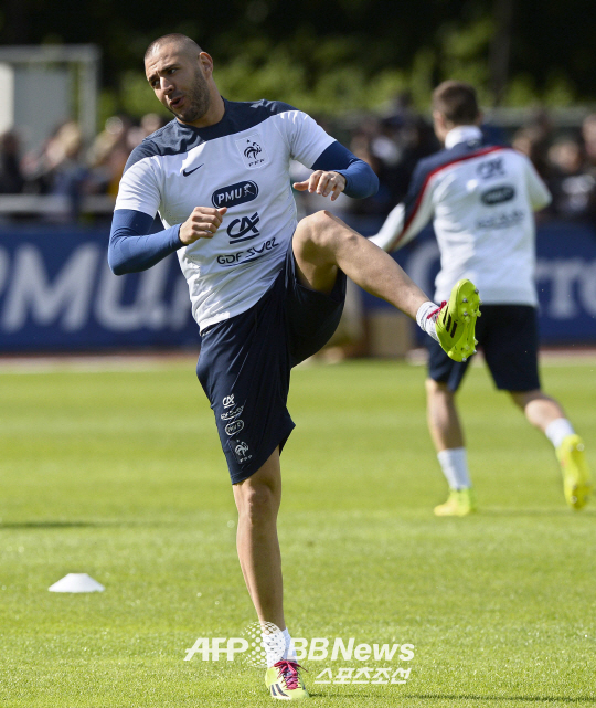 France's forward Karim Benzema takes part in a training session in Clairefontaine-en-Yvelines, outside Paris, on June 4, 2014, during France's national football team's preparation for the upcoming FIFA 2014 World Cup in Brazil. AFP PHOTO / FRANCK FIFE