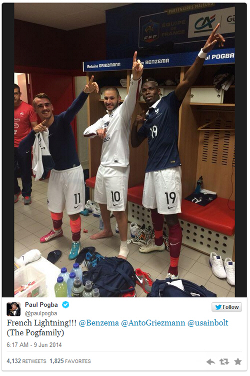 포그바는 이날 자신의 SNS에 "프랑스 번개!(Frech Lightning)"이라는 글과 함께 벤제마-그리에츠만과 함께 한 번개 세리머니 사진을 올렸다.