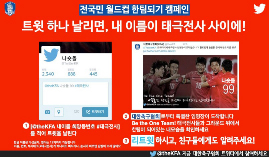 캠페인 참여 방법은 대한축구협회 공식 트위터 계정(@theKFA)으로 본인 이름과 희망하는 등번호, '#태극전사' 해시태그를 전송하면 된다. 참여를 완료하면 입력한 자신의 이름과 등번호를 단 선수가 기성용 구자철 손흥민 등 태극전사들이 함께 환호하는 '트윗그라피' 사진을 받게 된다.