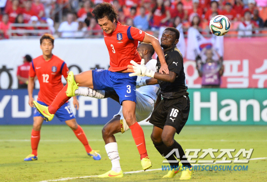 2014브라질월드컵 대표팀 한국과 가나의 평가전이 10일 오전(한국시간) 마이애미 선라이프 스타디움에서 열렸다. 한국 곽태휘가 가나의 골키퍼 다우다의 수비사이로 슈팅을 날리고 있다.