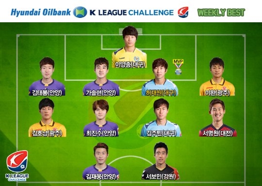 미드필더에서는 서명원(대전) 김주빈(대구) 최진수(안양) 김호남(광주)이 선정됐다. 최고 수비수로는 허재원을 포함해 이 완(광주) 가솔현 김태봉(이상 안양)이 선정됐다. 충주의 파상공세를 온 몸으로 막아낸 이양종(대구)이 베스트골키퍼가 됐다.