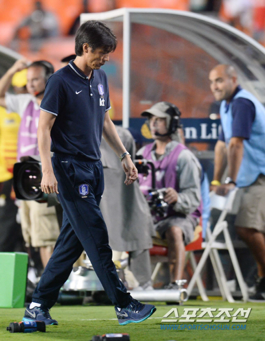 2014브라질월드컵 대표팀 한국과 가나의 평가전이 10일 오전(한국시간) 마이애미 선라이프 스타디움에서 열렸다. 4대0으로 참패한 한국의 홍명보 감독이 패색이 짙어진 경기를 지켜보고 있다.