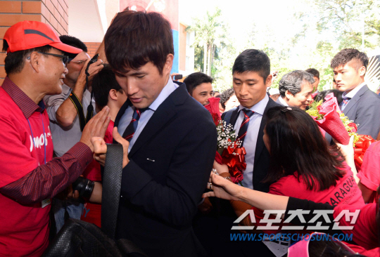 2014브라질월드컵 대표팀 홍명보호가 드디어 브라질에 입성했다. 홍명보호선수들이 12일오전 (한국시간) 브라질내 캠프가 위치한 이과수 버본호텔에 도착해 교민들의 환영을 받고 있다.