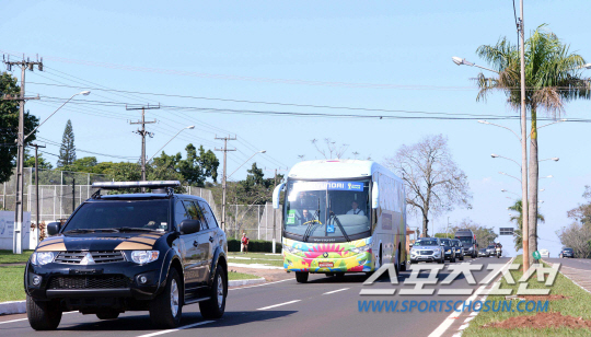 2014브라질월드컵 대표팀 홍명보호가 드디어 브라질에 입성했다. 홍명보호선수들이 12일오전 (한국시간) 캠프가 위치한 이과수에 내려 군인과 경찰들의 호위를 받으며 숙소인 버본호텔로 이동하고 있다