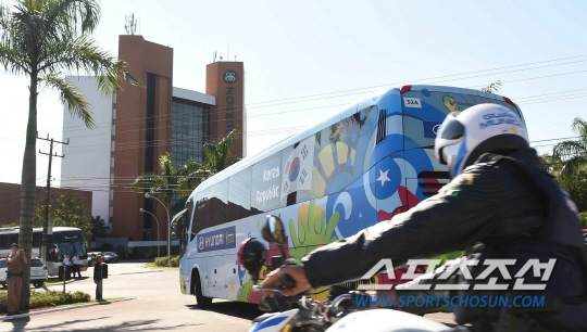 2014브라질월드컵 대표팀 홍명보호가 드디어 브라질에 입성했다. 홍명보호선수들이 12일오전 (한국시간) 캠프가 위치한 이과수에 내려 군인과 경찰들의 호위를 받으며 숙소인 버본호텔로 이동하고 있다