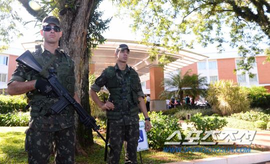 2014브라질월드컵 대표팀 홍명보호가 12일 오전 (한국시간) 드디어 브라질에 입성했다. 브라질 군인들이 홍명보호 선수들이 묵을 예정인 이과수 버본호텔을 철통같이 지키고 있다.
