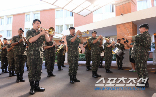 2014브라질월드컵 대표팀 홍명보호가 드디어 브라질에 입성했다. 홍명보호선수들이 12일오전 (한국시간) 브라질내 캠프가 위치한 이과수 버본호텔에 도착해 브라질 군악대의 환영을 받고 있다.