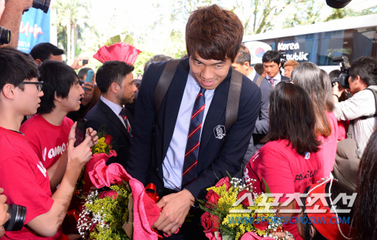 2014브라질월드컵 대표팀 홍명보호가 드디어 브라질에 입성했다. 홍명보호선수들이 12일오전 (한국시간) 브라질내 캠프가 위치한 이과수 버본호텔에 도착해 교민들의 환영을 받고 있다. 이범영이 교민들의 환영인파를 헤치며 호텔에 들어서고 있다.