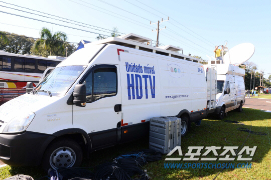 2014브라질월드컵 대표팀 홍명보호 선수들이 12일 오전(한국시간) 브라질에 입성했다. 현지 방송사 취재진이 홍명보호선수들의 숙소인 이과수 버본호텔앞에서 생중계를 준비하고 있다