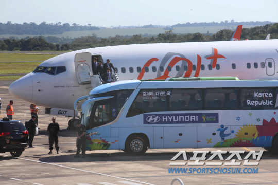 2014 브라질 월드컵 축구 국가대표팀이 12일 오전 (한국시각) 피파 전세기로 이과수 공항에 도착해 홍명보 감독 등이 활주로에 내리고 있다.