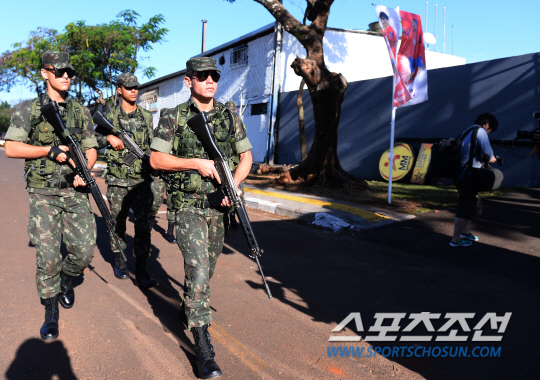 2014 브라질월드컵 대표팀이 12일 오전(한국시간) 브라질 캠프인 이과수의 플라멩고 스타디움에 도착해 첫 훈련에 돌입했다. 브라질 군인들이 대표팀의 훈련장을 삼엄하게 경계하고 있다.