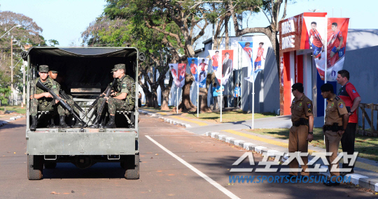 2014 브라질월드컵 대표팀이 12일 오전(한국시간) 브라질 캠프인 이과수의 플라멩고 스타디움에 도착해 첫 훈련에 돌입했다. 브라질 군인과 경찰들이 훈련장 주변을 삼엄하게 경비하고 있다.