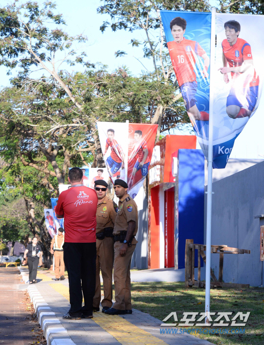 2014 브라질월드컵 대표팀이 12일 오전(한국시간) 브라질 캠프인 이과수의 플라멩고 스타디움에 도착해 첫 훈련에 돌입했다. 브라질 군인들이 대표팀의 훈련장을 삼엄하게 경계하고 있다.