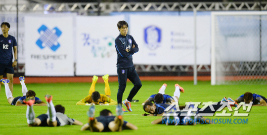 2014 브라질월드컵 대표팀이 12일 오전(한국시간) 브라질 캠프인 이과수의 플라멩고 스타디움에 도착해 첫 훈련에 돌입했다. 홍명보 감독이 스트레칭으로 마무리 훈련을 하는 태극전사들을 바라보고 있다.