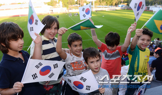 2014 브라질월드컵 대표팀이 12일 오전(한국시간) 브라질 캠프인 이과수의 플라멩고 스타디움에 도착해 첫 훈련에 돌입했다. 훈련기간중 하루는 일반에게 공개해야 하는 규정에 따라 한국팀 훈련장을 찾은 브라질 팬들이 열광하고 있다.
