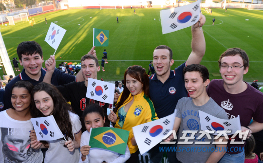 2014 브라질월드컵 대표팀이 12일 오전(한국시간) 브라질 캠프인 이과수의 플라멩고 스타디움에 도착해 첫 훈련에 돌입했다. 훈련기간중 하루는 일반에게 공개해야 하는 규정에 따라 한국팀 훈련장을 찾은 브라질 팬들이 열광하고 있다.