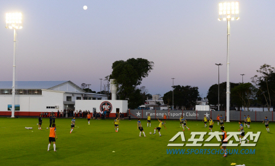 2014 브라질월드컵 대표팀이 12일 오전(한국시간) 브라질 캠프인 이과수의 플라멩고 스타디움에 도착해 첫 훈련에 돌입했다. 대표팀 선수들이 조명을 밝힌채 훈련에 집중하고 있다.