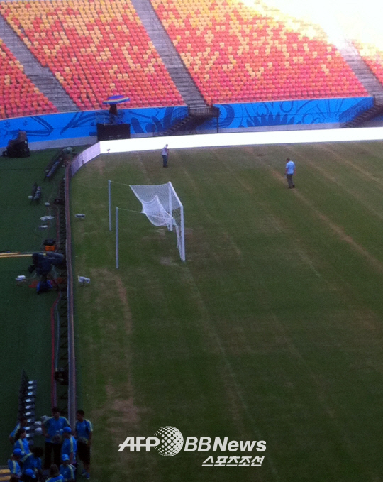 공개된 사진에는 경기장 절반의 잔디 상태가 심각한 수준이다. 잔디가 제대로 자라지 않아 흙바닥 수준이다.