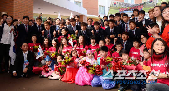 2014브라질월드컵 대표팀 홍명보호가 드디어 브라질에 입성했다. 홍명보호선수들이 11일오전 (한국시간) 브라질내 캠프가 위치한 이과수 버본호텔에 도착해 교민들과 기념촬영을 하고 있다. 마이애미(미국)=최문영 기자 deer@sportschosun.com /2014.06.11/