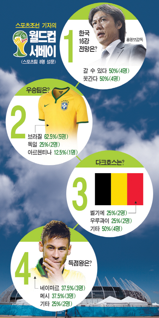 스포츠조선은 개막에 맞춰 축구전문기자 8명의 설문으로 브라질월드컵을 전망했다. 한국의 16강 진출 여부를 첫 번째 도마에 올렸다.