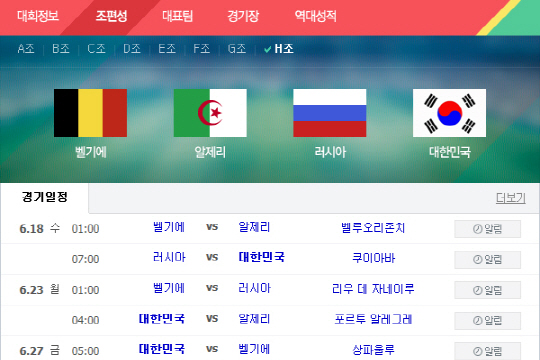 한국은 18일 오전 7시 쿠이아바의 아레나 판타날에서 러시아와 첫 경기로 월드컵의 대단원을 시작한다. 이후 23일 오전 4시 포르투 알레그레의 에스타디오 베이라-리오에서 알제리와 27일 오전 5시 상파울루의 아레나 데 상파울루에서 벨기에와 차례로 맞붙는다.