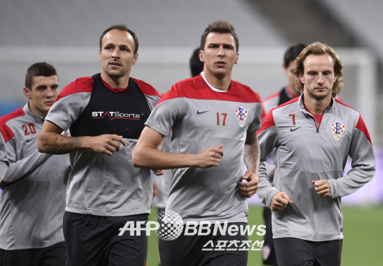 ◇크로아티아의 만주키치(오른쪽에서 두 번째)가 동료들과 함께 러닝을 하면 몸을 풀고 있다. 상파울루(브라질)=ⓒAFPBBNews = News1