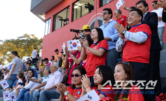 2014 브라질월드컵 대표팀이 12일 오전(한국시간) 브라질 캠프인 이과수의 플라멩고 스타디움에 도착해 첫 훈련에 돌입했다. 훈련기간중 하루는 일반에게 공개해야 하는 규정에 따라 한국팀 훈련장을 찾은 교민들이 열띤 환호를 보내고 있다. 대표팀은 이과수 베이스캠프에서 현지 적응을 마친후 18일(한국시간) 꾸이아바로 이동해 러시아와 첫 경기를 치른다. 이과수(브라질)=최문영 기자 deer@sportschosun.com
