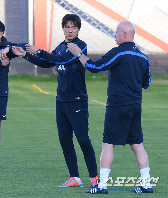 2014 브라질월드컵 홍명보호가 13일 오전(한국시간) 브라질 이구아수 훈련 캠프에서 이틀째 훈련에 돌입했다. 훈련에 앞서 홍명보 감독과 안톤코치가 훈련계획에 대해 얘기하고 있다.